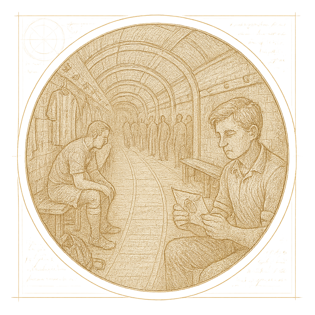 Through the dressing room walls, crowd noise builds toward kickoff. Eighty thousand voices that don't know their striker just became infantry. Klaus folds the conscription order, tucks it into his kit bag next to boots he'll never wear again.