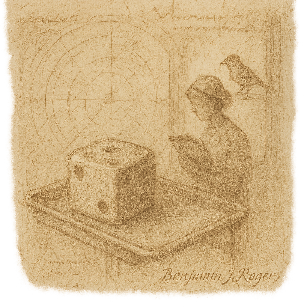 The die tumbles across metal, sound sharp as winter. When it stops, she doesn't look. Instead, she watches the sparrow tap the glass with its beak - once, twice, three times - before vanishing into the boundless, unmeasured sky.